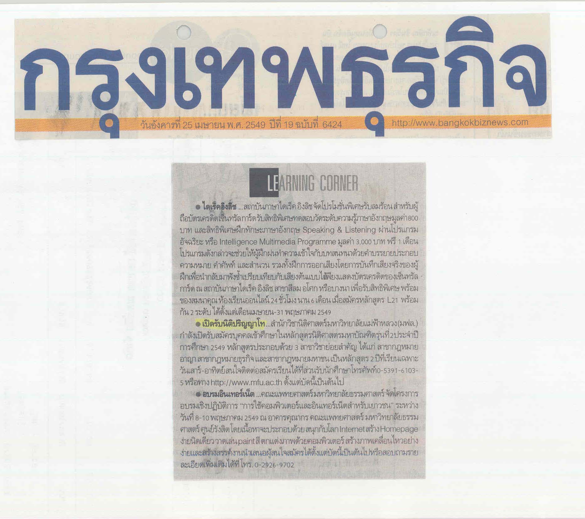 กรุงเทพธุรกิจ, วันที่ 25 เมษายน 2549