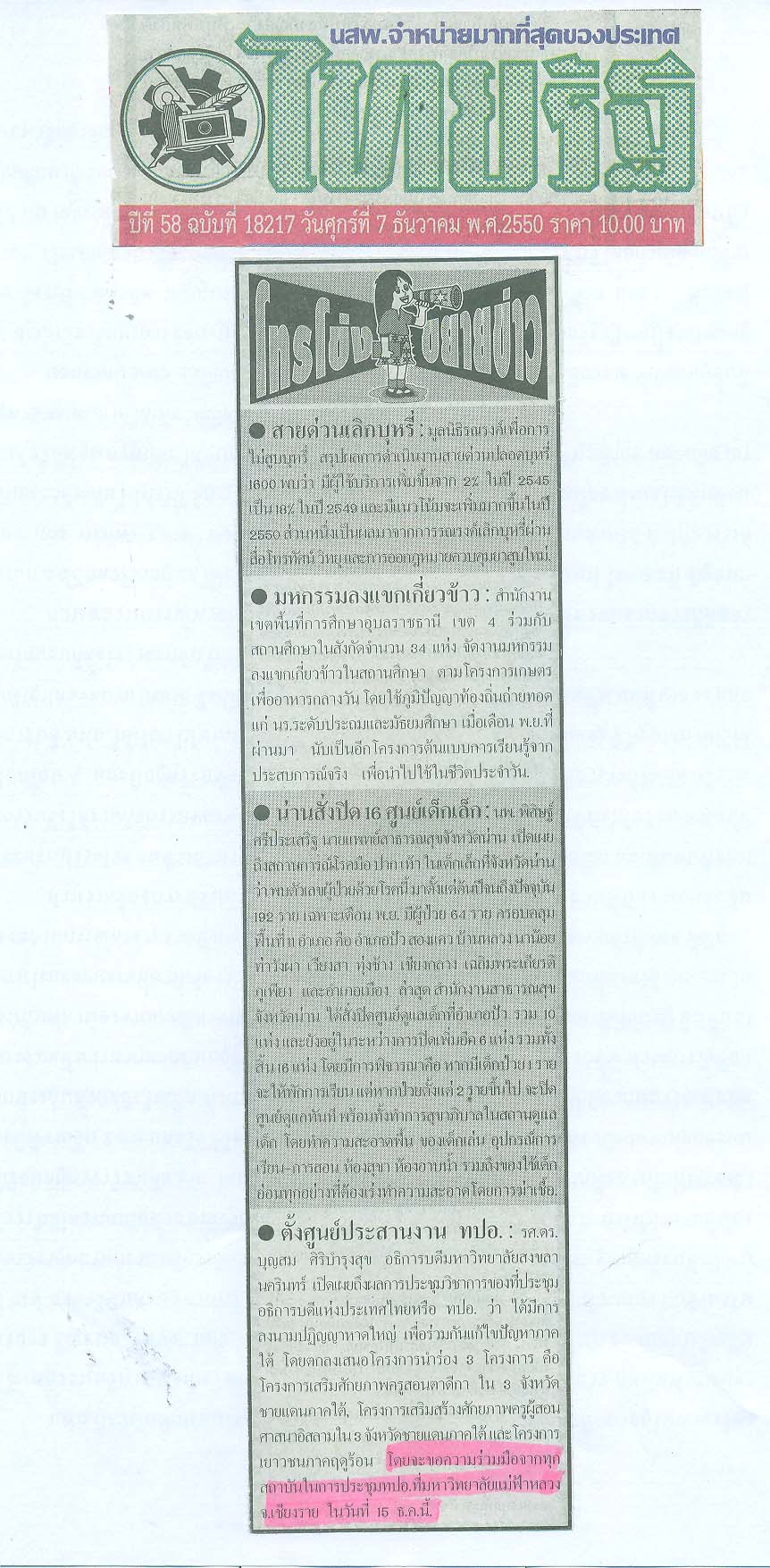 ไทยรัฐ, วันที่ 7 ธันวาคม 2550