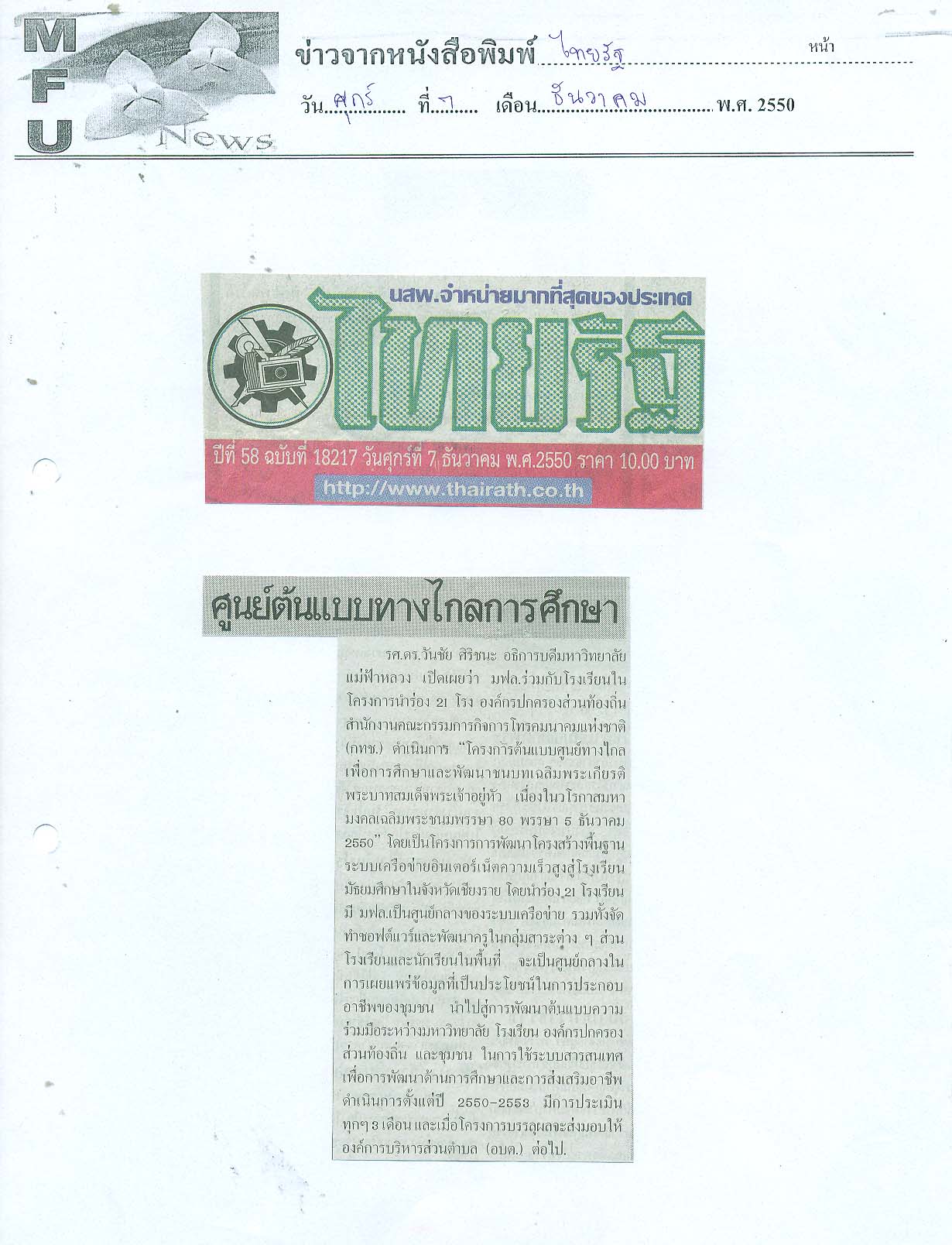 กฤตภาคข่าวมหาวิทยาลัยแม่ฟ้าหลวง ส่วนกลาง พ.ศ. 2550 กล่อง 7