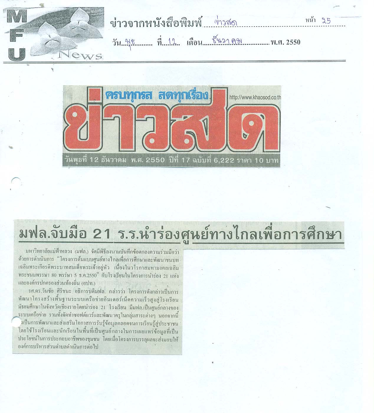 กฤตภาคข่าวมหาวิทยาลัยแม่ฟ้าหลวง ส่วนกลาง พ.ศ. 2550 กล่อง 7