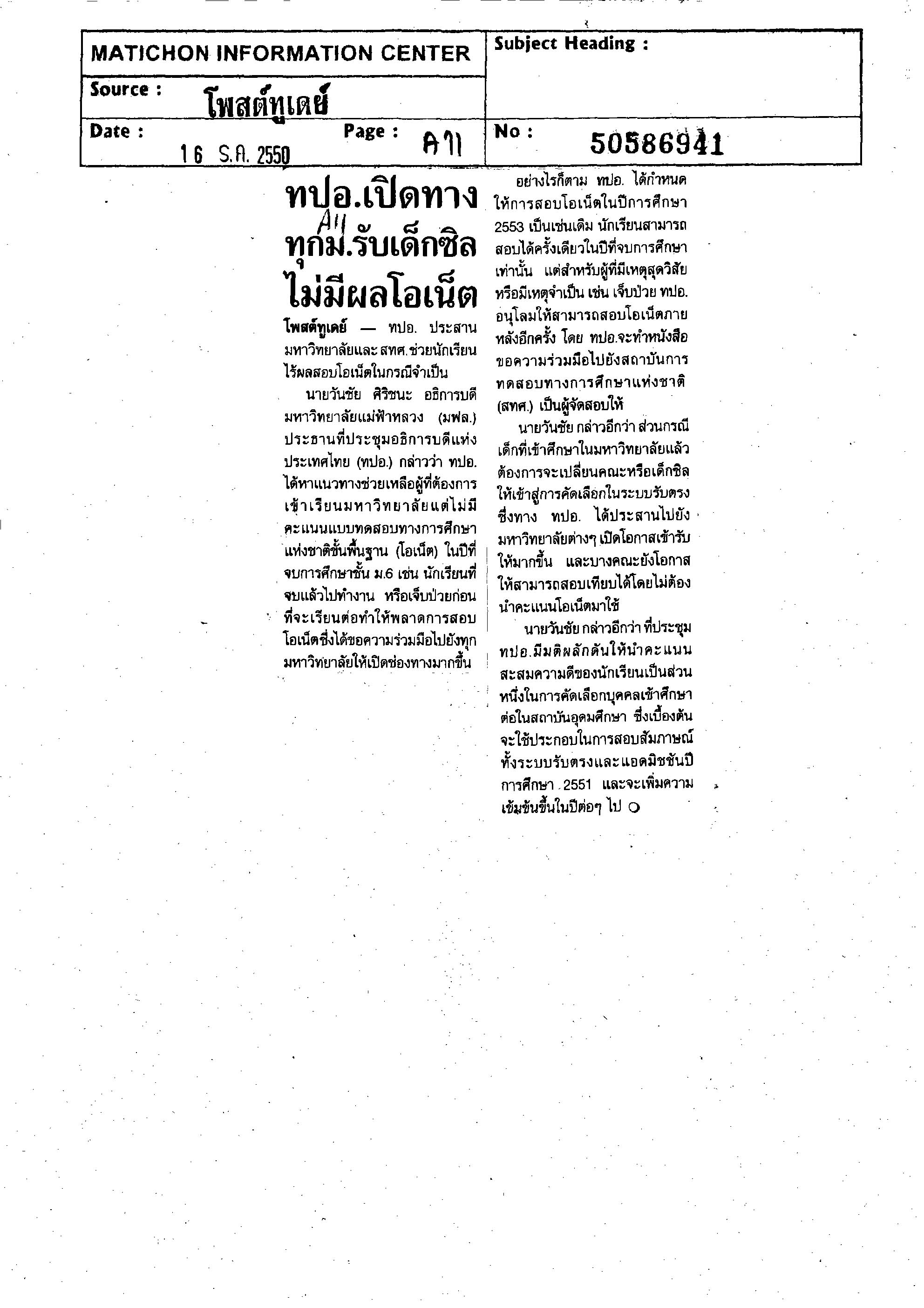 ทปอ.เปิดทาง ทุกมหาวิทยาลัยรับเด็กซิล ไม่มีผลโอเน็ต