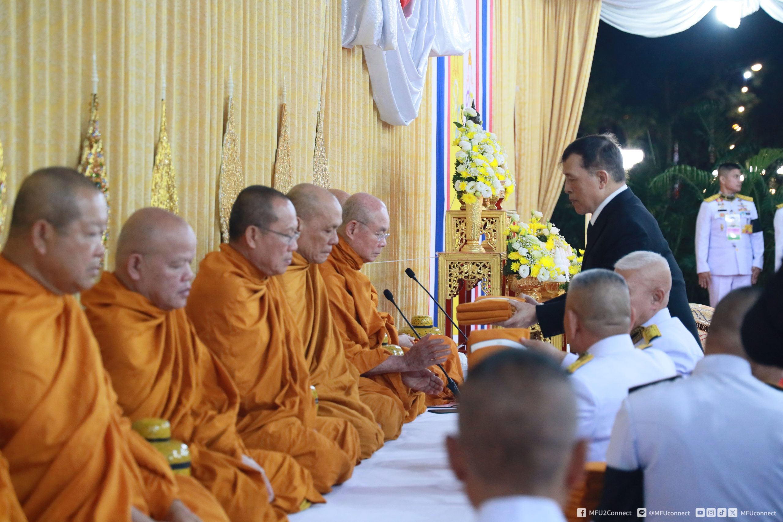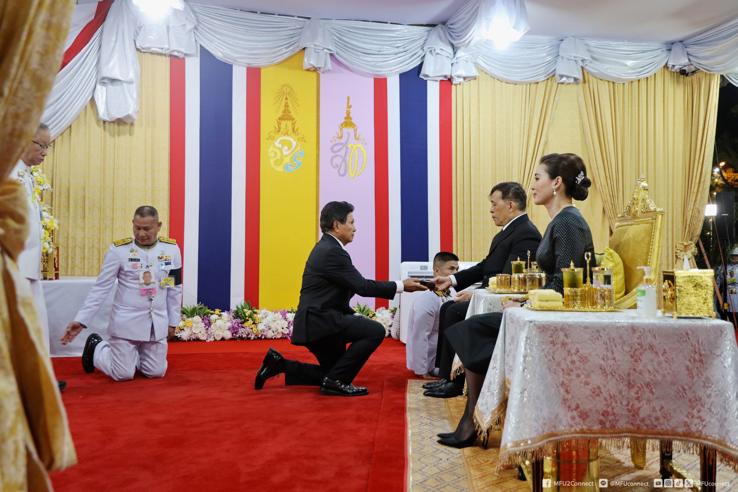 จากนั้นเสด็จฯ เข้าพลับพลาพิธี พระบาทสมเด็จพระเจ้าอยู่หัว ทรงจุดธูปเทียนเครื่องนมัสการทองทิศ บูชาพระพุทธนวราชบพิตร ทรงกราบ ประทับพระราชอาสน์ และทรงศีล ประธานสงฆ์ถวายศีลจบแล้ว พระราชทานพระบรมราชวโรกาสให้รองศาสตราจารย์ นายแพทย์ปรีชา สุนทรานันท์ คณบดีสำนักวิชาแพทยศาสตร์ เข้าเฝ้าฯ ทูลเกล้าฯ ถวายสูจิบัตร แด่พระบาทสมเด็จพระเจ้าอยู่หัว และผู้ช่วยศาสตราจารย์ ดร.ชมพูนุช โสภาจารีย์ คณบดีสำนักวิชาพยาบาลศาสตร์ เข้าเฝ้าฯ ทูลเกล้าฯ ถวายสูจิบัตร แด่สมเด็จพระนางเจ้า ฯ พระบรมราชินี ศาสตราจารย์พิเศษ ดร.วันชัย ศิริชนะ นายกสภามหาวิทยาลัยแม่ฟ้าหลวง กราบบังคมทูลสำนึกในพระมหากรุณาธิคุณ ผู้ช่วยศาสตราจารย์ ดร.มัชฌิมา นราดิศร อธิการบดีมหาวิทยาลัยแม่ฟ้าหลวง กราบบังคมทูลรายงานวัตถุประสงค์ของการจัดสร้างพระราชานุสาวรีย์สมเด็จพระมหิตลาธิเบศร อดุลยเดชวิกรม พระบรมราชชนก ประทับคู่สมเด็จพระศรีนครินทราบรมราชชนนี พร้อมทั้งขอพระราชทานกราบบังคมทูลเชิญเสด็จฯ ทรงประกอบพิธีเปิดพระราชานุสาวรีย์ฯ และขอพระราชทานกราบบังคมทูลเบิกผู้มีอุปการคุณต่อมหาวิทยาลัยแม่ฟ้าหลวง เข้าเฝ้าฯ รับพระราชทานของที่ระลึก ตามลำดับ