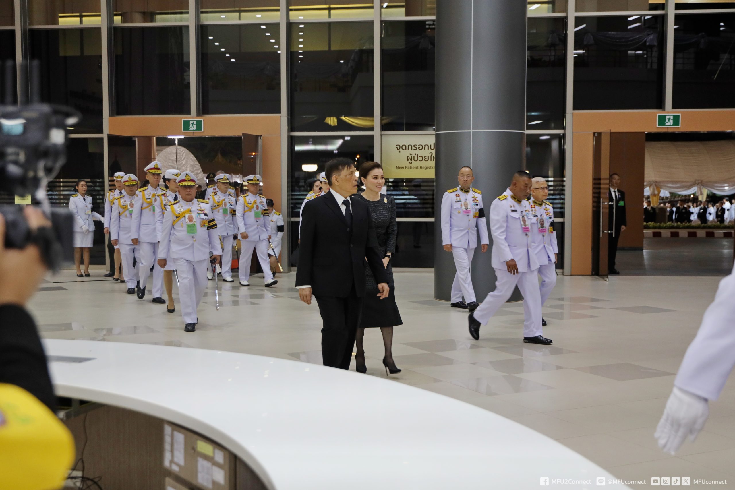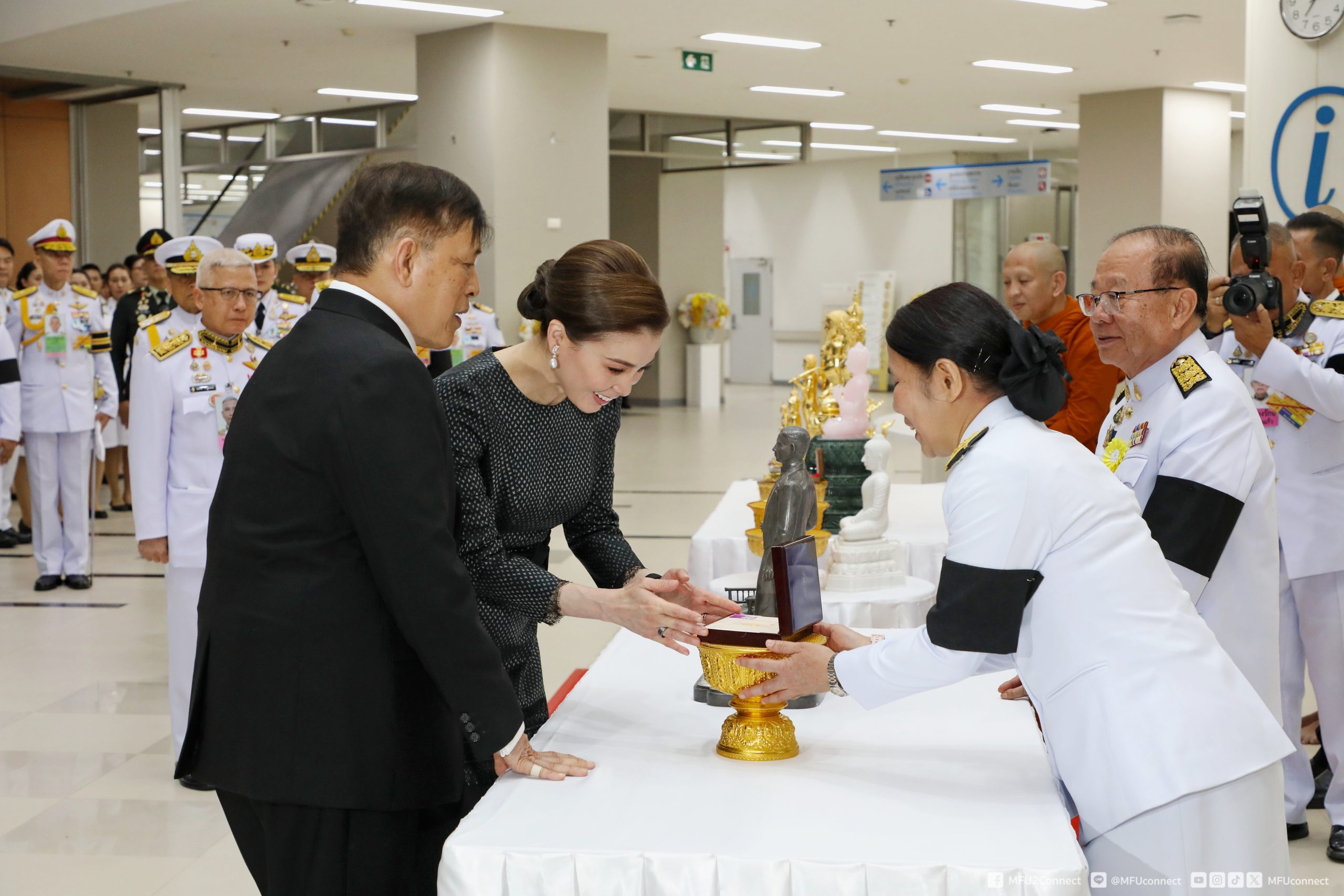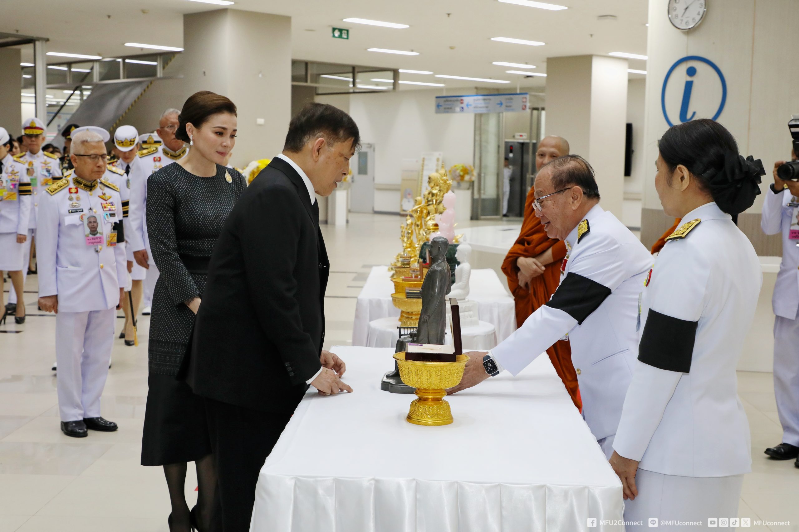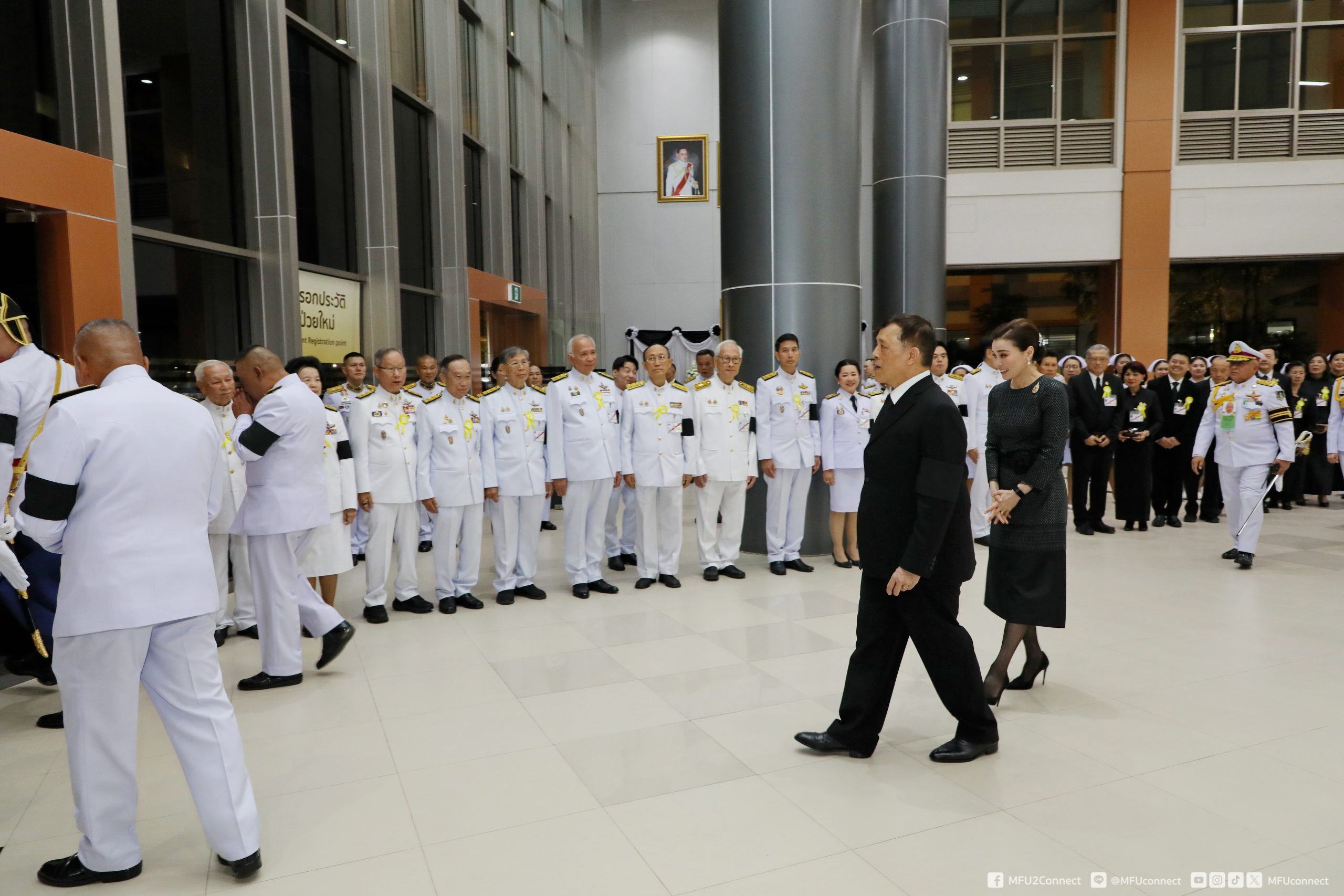 จากนั้นเสด็จออกจากบริเวณฉายพระบรมฉายาลักษณ์ ชั้น 2 ไปยังชั้น 1 พระราชทานพระบรมราชวโรกาสให้ศาสตราจารย์พิเศษ ดร.วันชัย ศิริชนะ นายกสภามหาวิทยาลัยแม่ฟ้าหลวง น้อมเกล้าฯ ถวายพระรูปพระราชานุสาวรีย์สมเด็จพระมหิตลาธิเบศร อดุลยเดชวิกรม พระบรมราชชนกประทับคู่สมเด็จพระศรีนครินทราบรมราชชนนี (จำลอง) แด่พระบาทสมเด็จพระเจ้าอยู่หัว จำนวน 1 องค์ และผู้ช่วยศาสตราจารย์ ดร.มัชฌิมา นราดิศร อธิการบดีมหาวิทยาลัยแม่ฟ้าหลวง ทูลเกล้าฯ ถวายเหรียญที่ระลึก แด่สมเด็จพระนางเจ้า ฯ พระบรมราชินี สมควรแก่เวลา จึงประทับรถยนต์พระที่นั่ง เสด็จพระราชดำเนินออกจากโรงพยาบาลศูนย์การแพทย์ มหาวิทยาลัยแม่ฟ้าหลวง อำเภอเมืองเชียงราย จังหวัดเชียงราย ไปยังท่าอากาศยานแม่ฟ้าหลวง เชียงราย อำเภอเมืองเชียงราย จังหวัดเชียงราย (วงดุริยางค์บรรเลงเพลงสรรเสริญพระบารมี)