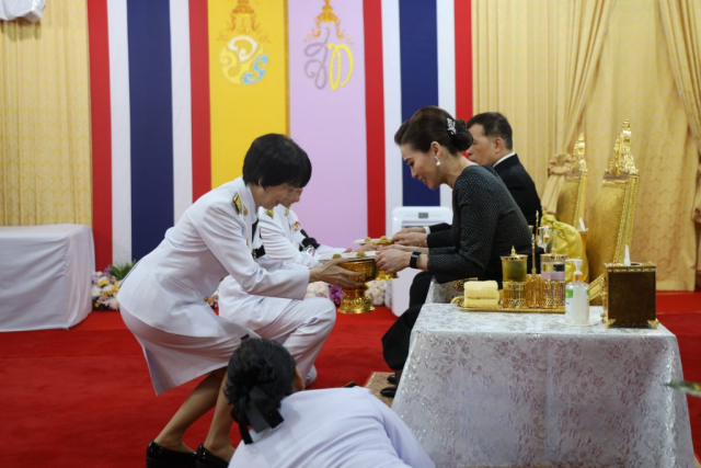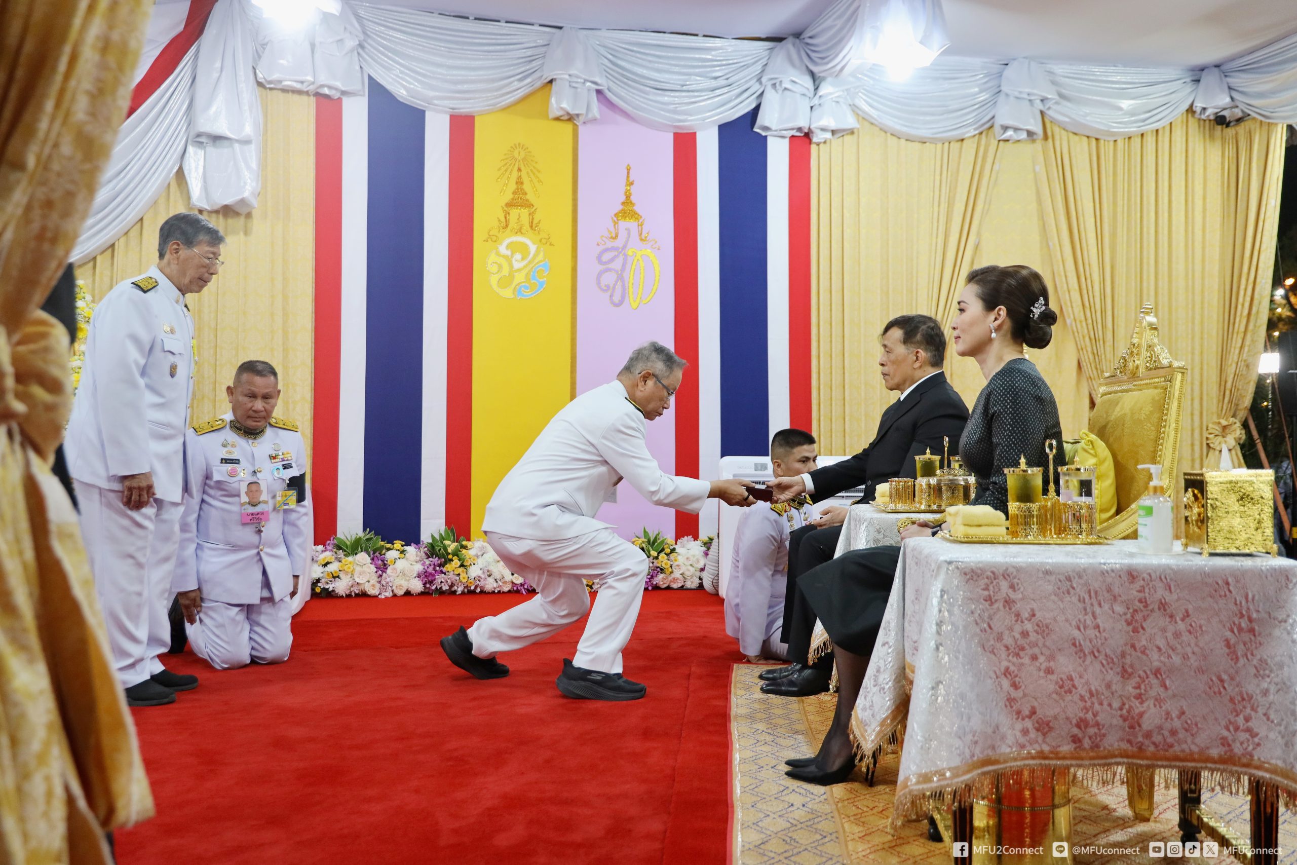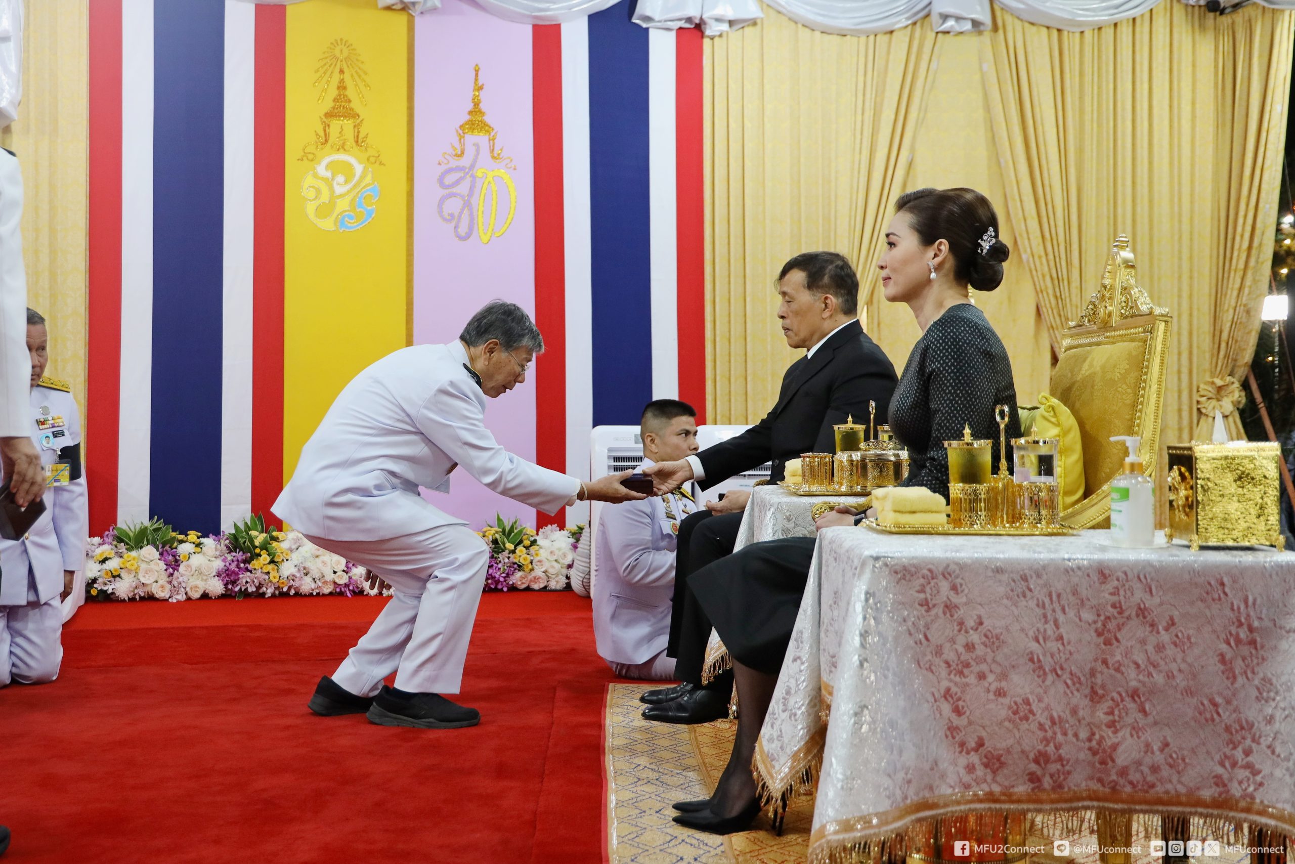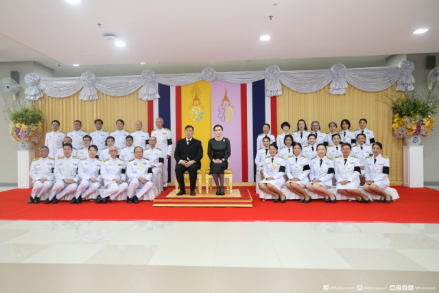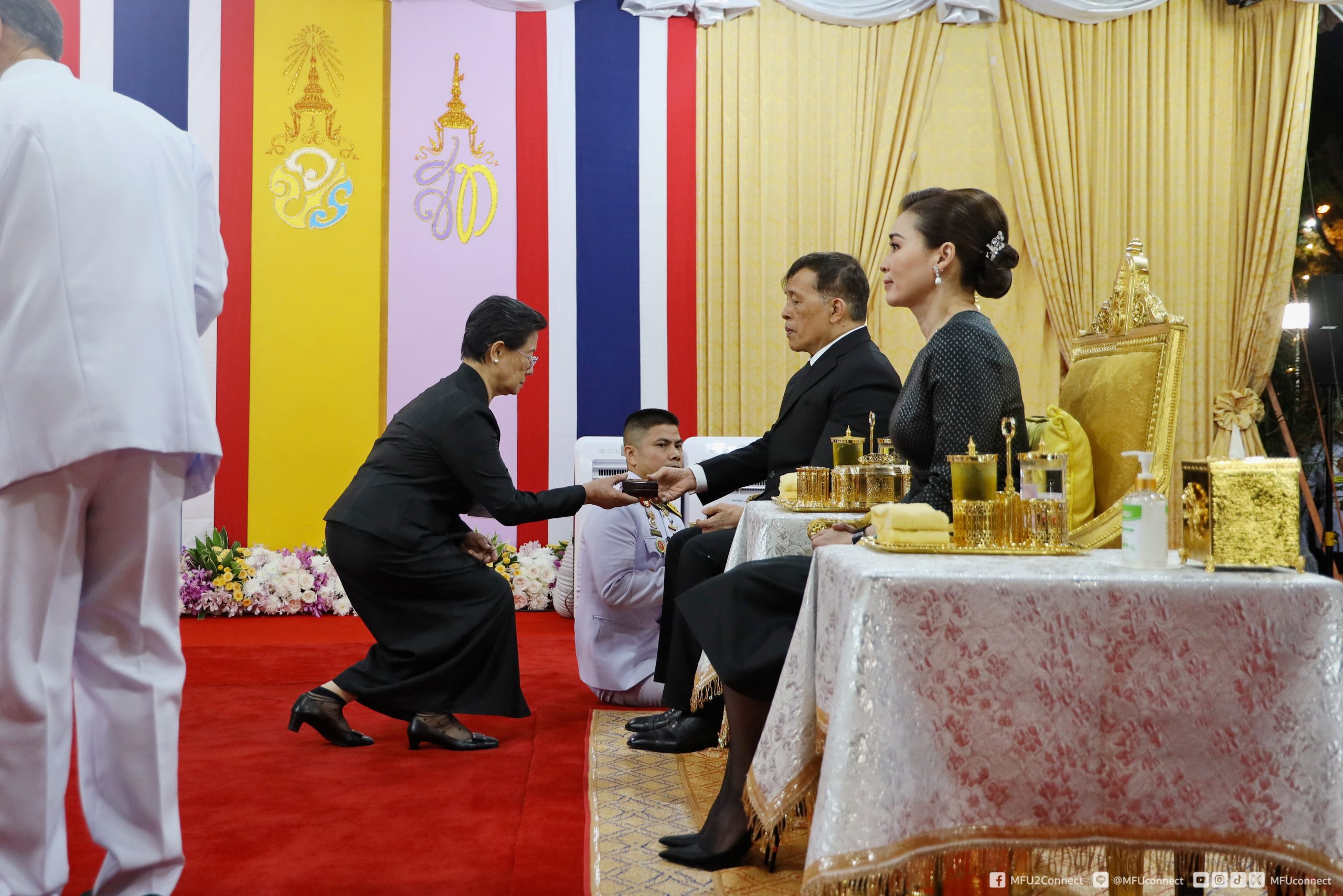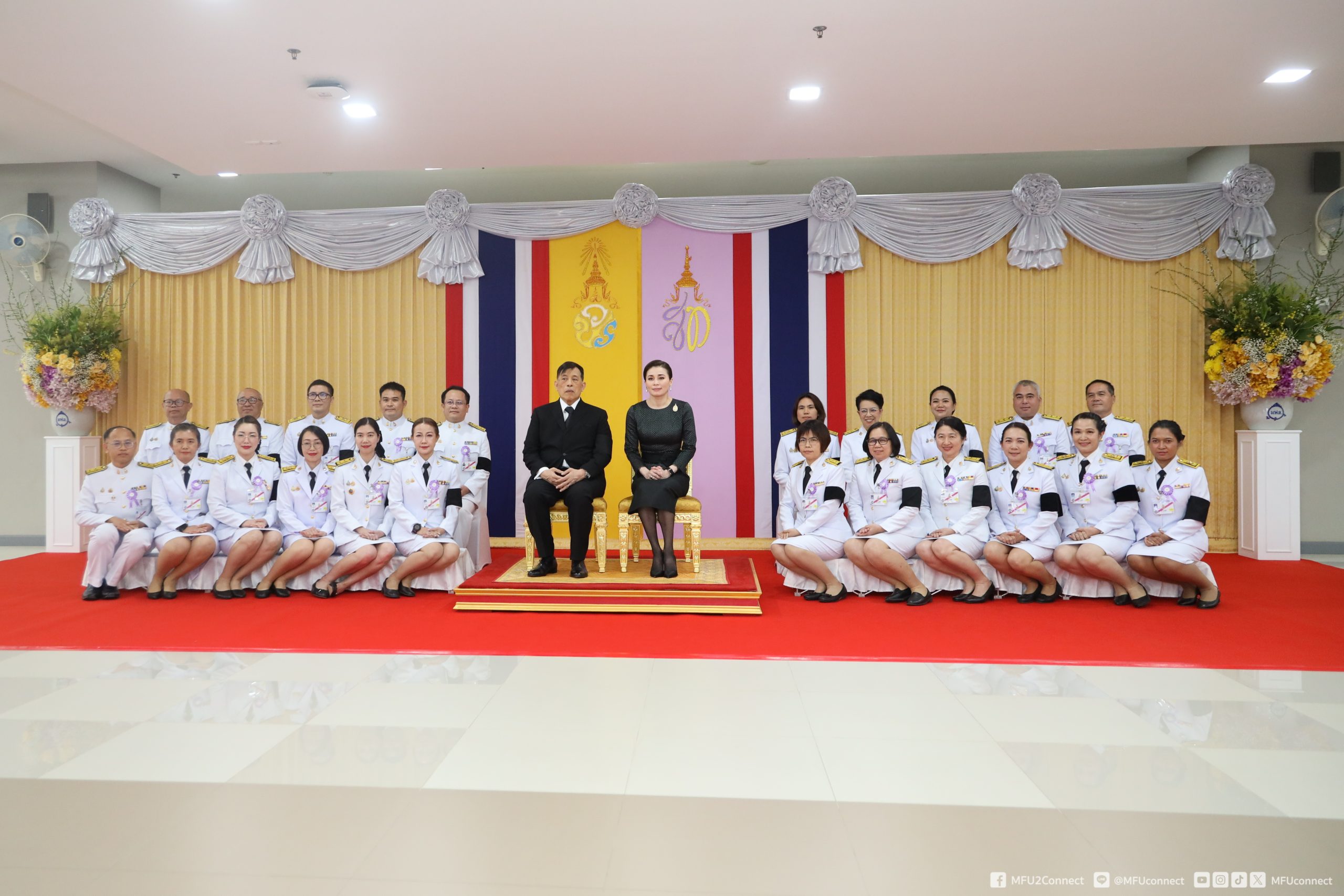 จากนั้นเสด็จออกจากบริเวณฉายพระบรมฉายาลักษณ์ ชั้น 2 ไปยังชั้น 1 พระราชทานพระบรมราชวโรกาสให้ศาสตราจารย์พิเศษ ดร.วันชัย ศิริชนะ นายกสภามหาวิทยาลัยแม่ฟ้าหลวง น้อมเกล้าฯ ถวายพระรูปพระราชานุสาวรีย์สมเด็จพระมหิตลาธิเบศร อดุลยเดชวิกรม พระบรมราชชนกประทับคู่สมเด็จพระศรีนครินทราบรมราชชนนี (จำลอง) แด่พระบาทสมเด็จพระเจ้าอยู่หัว จำนวน 1 องค์ และผู้ช่วยศาสตราจารย์ ดร.มัชฌิมา นราดิศร อธิการบดีมหาวิทยาลัยแม่ฟ้าหลวง ทูลเกล้าฯ ถวายเหรียญที่ระลึก แด่สมเด็จพระนางเจ้า ฯ พระบรมราชินี สมควรแก่เวลา จึงประทับรถยนต์พระที่นั่ง เสด็จพระราชดำเนินออกจากโรงพยาบาลศูนย์การแพทย์ มหาวิทยาลัยแม่ฟ้าหลวง อำเภอเมืองเชียงราย จังหวัดเชียงราย ไปยังท่าอากาศยานแม่ฟ้าหลวง เชียงราย อำเภอเมืองเชียงราย จังหวัดเชียงราย (วงดุริยางค์บรรเลงเพลงสรรเสริญพระบารมี)