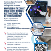 ขอเรียนเชิญอาจารย์ บุคลากร และนักศึกษาที่สนใจเข้าร่วมรับฟังการบรรยายพิเศษ"การประกอบธุรกิจและการทำงานของคนต่างชาติในประเทศไทย การใช้บัญชีเงินฝาก บัตรอิเล็กทรอนิกส์ และบัญชีอิเล็กทรอนิกส์อย่างถูกต้อง"