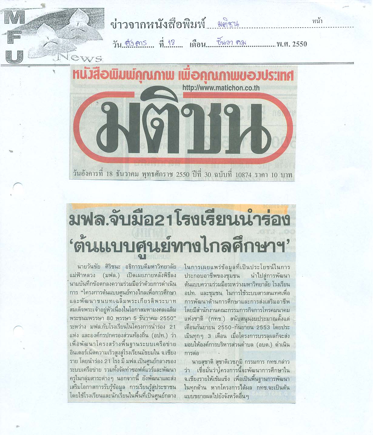 กฤตภาคข่าวมหาวิทยาลัยแม่ฟ้าหลวง ส่วนกลาง พ.ศ. 2550 กล่อง 7