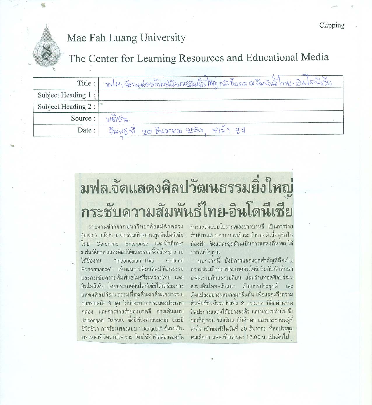 กฤตภาคข่าวมหาวิทยาลัยแม่ฟ้าหลวง ส่วนกลาง พ.ศ. 2550 กล่อง 7