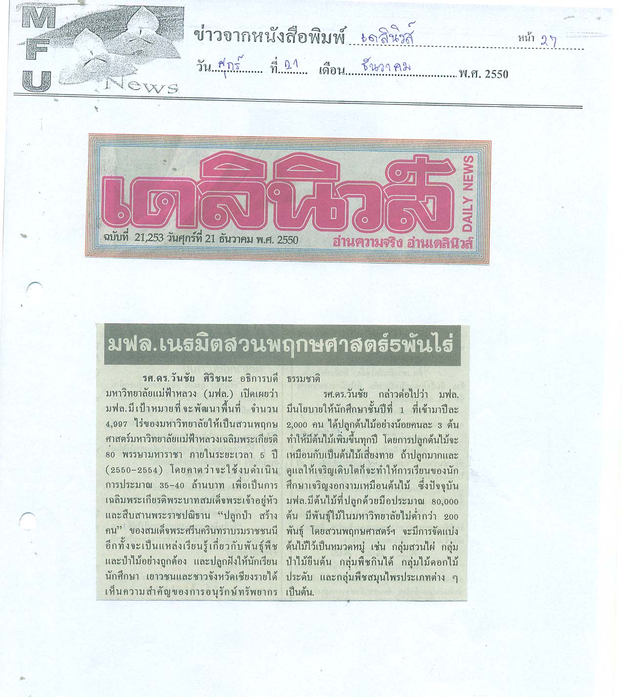 เดลินิวส์, วันที่ 21 ธันวาคม 2550 น.27